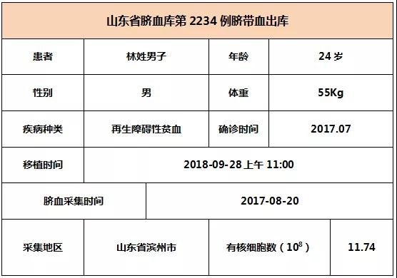2018年9月28日上午11:00,24歲林姓男子因患再生障礙性貧血,在福建某三甲醫(yī)院接受臍帶血移植,參與本次移植的臍帶血與患者8/10位點相合,有核細(xì)胞數(shù)為11.74*10^8。整個輸注過程很順利,無不良反應(yīng),愿患者早日恢復(fù)健康。