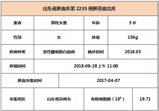 2018年9月28日上午11:00,3歲郭姓女童因患急性髓細(xì)胞白血病,在河北某三甲醫(yī)院接受臍帶血移植,參與本次移植的臍帶血與患者4/6位點相合,有核細(xì)胞數(shù)為19.71*10^8。整個輸注過程很順利,無不良反應(yīng),愿患者早日恢復(fù)健康。