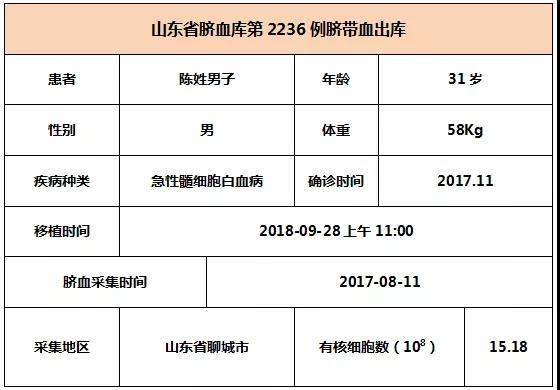 2018年9月28日上午11:00,31歲陳姓男子因患急性髓細胞白血病,在北京某三甲醫(yī)院接受臍帶血移植,參與本次移植的臍帶血與患者7/10位點相合,有核細胞數(shù)為15.18*10^8。整個輸注過程很順利,無不良反應,愿患者早日恢復健康。