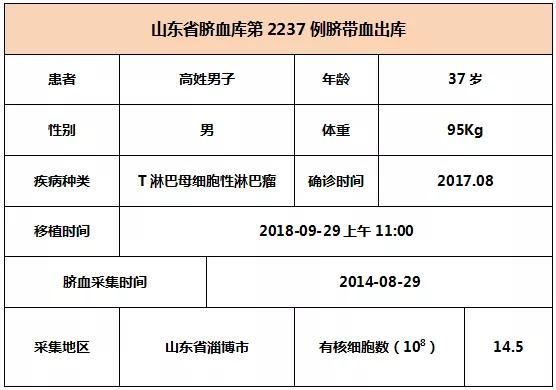 2018年9月29日上午11:00,37歲高姓男子因患T淋巴母細胞性淋巴瘤,在北京某三甲醫(yī)院接受臍帶血移植,參與本次移植的臍帶血與患者7/10位點相合,有核細胞數(shù)為14.5*10^8。整個輸注過程很順利,無不良反應,愿患者早日恢復健康。