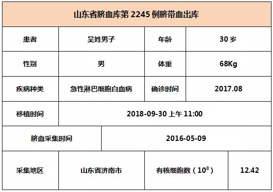 2018年9月30日上午11:00,30歲吳姓男子因患急性淋巴細(xì)胞白血病,在河北某三甲醫(yī)院接受臍帶血移植,參與本次移植的臍帶血與患者4/6位點(diǎn)相合,有核細(xì)胞數(shù)為12.42*10^8。整個(gè)輸注過(guò)程很順利,無(wú)不良反應(yīng),愿患者早日恢復(fù)健康。