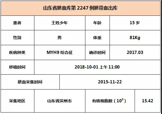2018年10月01日上午11:00,15歲王姓少年因患MYH9綜合征,在遼寧某三甲醫(yī)院接受臍帶血移植,參與本次移植的臍帶血與患者6/10位點(diǎn)相合,有核細(xì)胞數(shù)為15.42*10^8。整個(gè)輸注過(guò)程很順利,無(wú)不良反應(yīng),愿患者早日恢復(fù)健康。