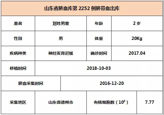 2018年1003日,2歲劉姓男童因患神經發育遲緩,廣州某三甲醫院接受自體臍帶血移植,參與本次移植的臍帶血與患者10/10位點相合,有核細胞數為7.77*10^8。整個輸注過程很順利,無不良反應,愿患者早日恢復健康。