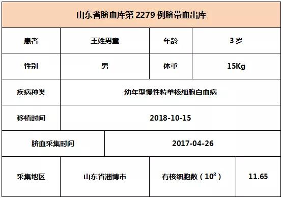 2018年10月15日,3歲王姓男童因患幼年型慢性粒單核細胞白血病,在四川某三甲醫院接受臍帶血移植,參與本次移植的臍帶血與患者6/10位點相合,有核細胞數為11.65*10^8。整個輸注過程很順利,無不良反應,愿患者早日恢復健康。