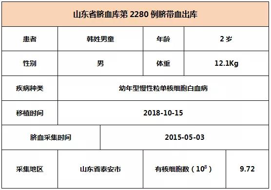 2018年10月15日,2歲韓姓男童因患幼年型慢性粒單核細胞白血病,在廣東某三甲醫院接受臍帶血移植,參與本次移植的臍帶血與患者8/10位點相合,有核細胞數為9.72*10^8。整個輸注過程很順利,無不良反應,愿患者早日恢復健康。