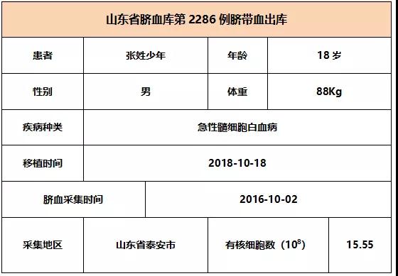 2018年10月18日,18歲張姓少年因患急性髓細胞白血病,在河北某三甲醫院接受臍帶血移植,參與本次移植的臍帶血與患者4/6位點相合,有核細胞數為15.55*10^8。整個輸注過程很順利,無不良反應,愿患者早日恢復健康。