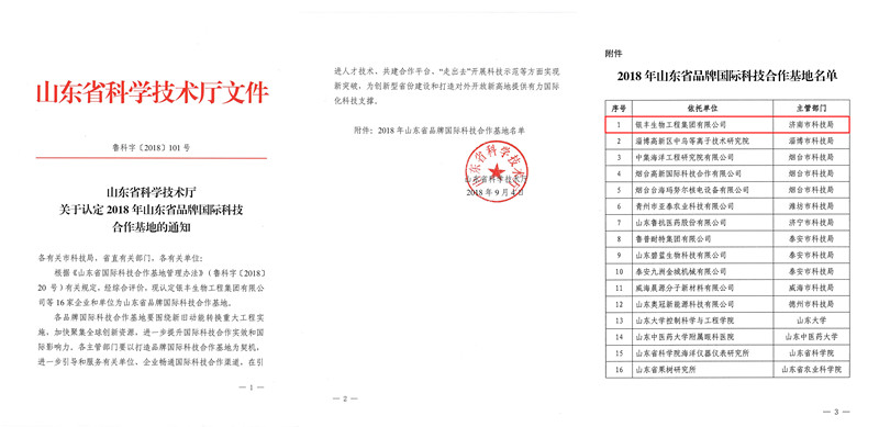 近日,銀豐生物集團(tuán)經(jīng)山東省科學(xué)技術(shù)廳認(rèn)定,榮獲山東省科學(xué)技術(shù)廳2018年山東省品牌國(guó)際科技合作基地和2018年重點(diǎn)研發(fā)計(jì)劃(國(guó)際合作)項(xiàng)目100萬資金扶持。
