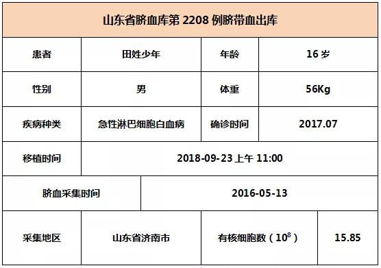 2018年9月23日上午11:00,16歲田姓少年因患急性淋巴細(xì)胞白血病,在河北某三甲醫(yī)院接受臍帶血移植,參與本次移植的臍帶血與患者4/6位點相合,有核細(xì)胞數(shù)為15.85*10^8。整個輸注過程很順利,無不良反應(yīng),愿患者早日恢復(fù)健康。