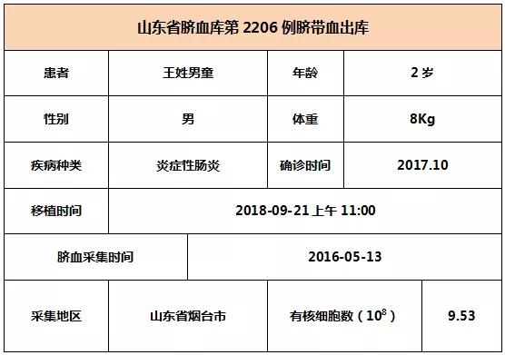 2018年9月21日上午11:00,2歲王姓男童因患炎癥性腸炎,在上海某三甲醫(yī)院接受臍帶血移植,參與本次移植的臍帶血與患者9/10位點相合,有核細(xì)胞數(shù)為9.53*10^8。整個輸注過程很順利,無不良反應(yīng),愿患者早日恢復(fù)健康。