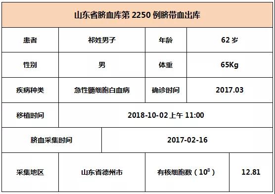 2018年10月02日上午11:00,62歲祁姓男子因患急性髓細胞白血病,在武漢某三甲醫院接受臍帶血移植,參與本次移植的臍帶血有核細胞數為12.81*10^8。整個輸注過程很順利,無不良反應,愿患者早日恢復健康。
