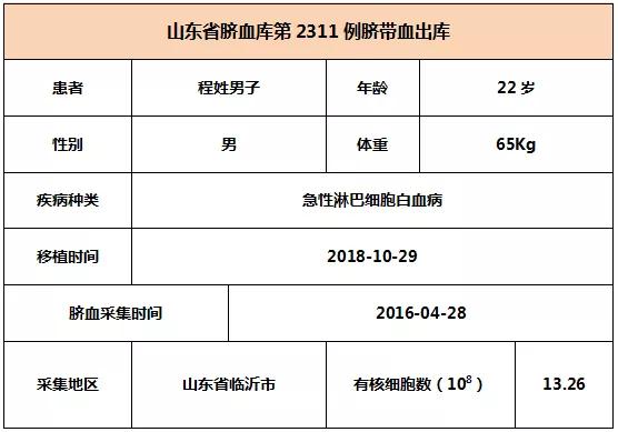 2018年10月29日,22歲程姓男子因患急性淋巴細胞白血病,在安徽某三甲醫院接受臍帶血移植,本次移植的臍帶血與患者6/10位點相合,有核細胞數為13.26*10^8。整個輸注過程很順利,無不良反應,愿患者早日恢復健康。